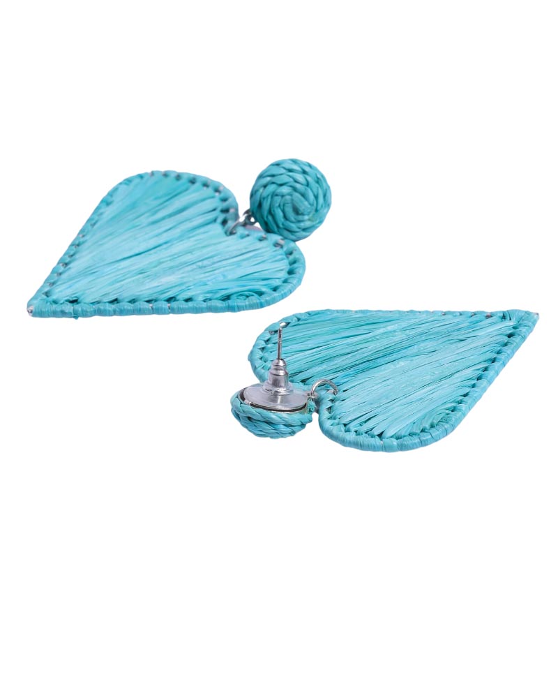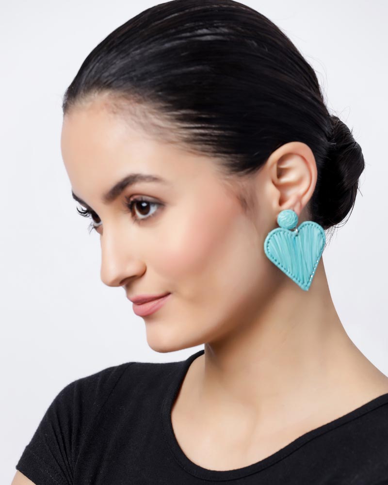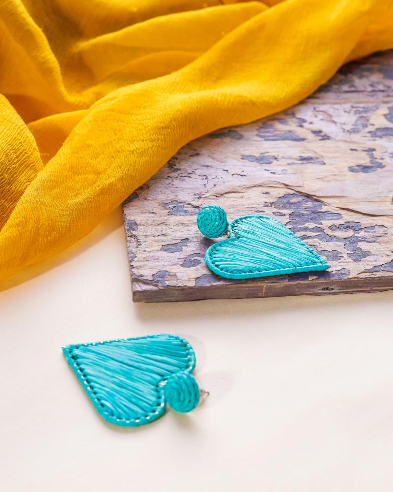 Perfect Gift for Loved One is Aqua Blue Heart Shape Sustainable Raffia Dangle Earrings from Jugals. The sustainable and eco-friendly earrings are stylish and add sweetness to your face.