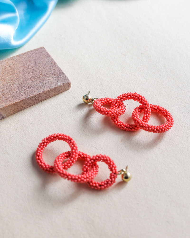The moment you search for handcrafted jewellery, Jugal’s Sustainable Coral Pink Beaded Triple Round Link Dangle Earrings is the right choice for you. Your dress always looks best when you wear matched earrings with it. Look beautiful and unique by wearing the best sustainable and eco-friendly earrings.